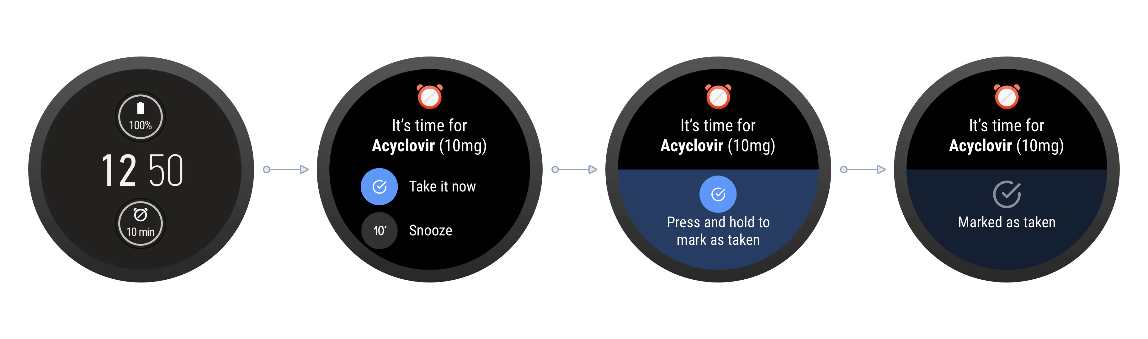 The most common interaction comprises the following elements: notifying the user of the appropriate medication, marking the medication as taken and snoozing the notification, if the user is unable at the moment. The notification is succint, in order to keep the text size legible due to the confined screen real-estate.